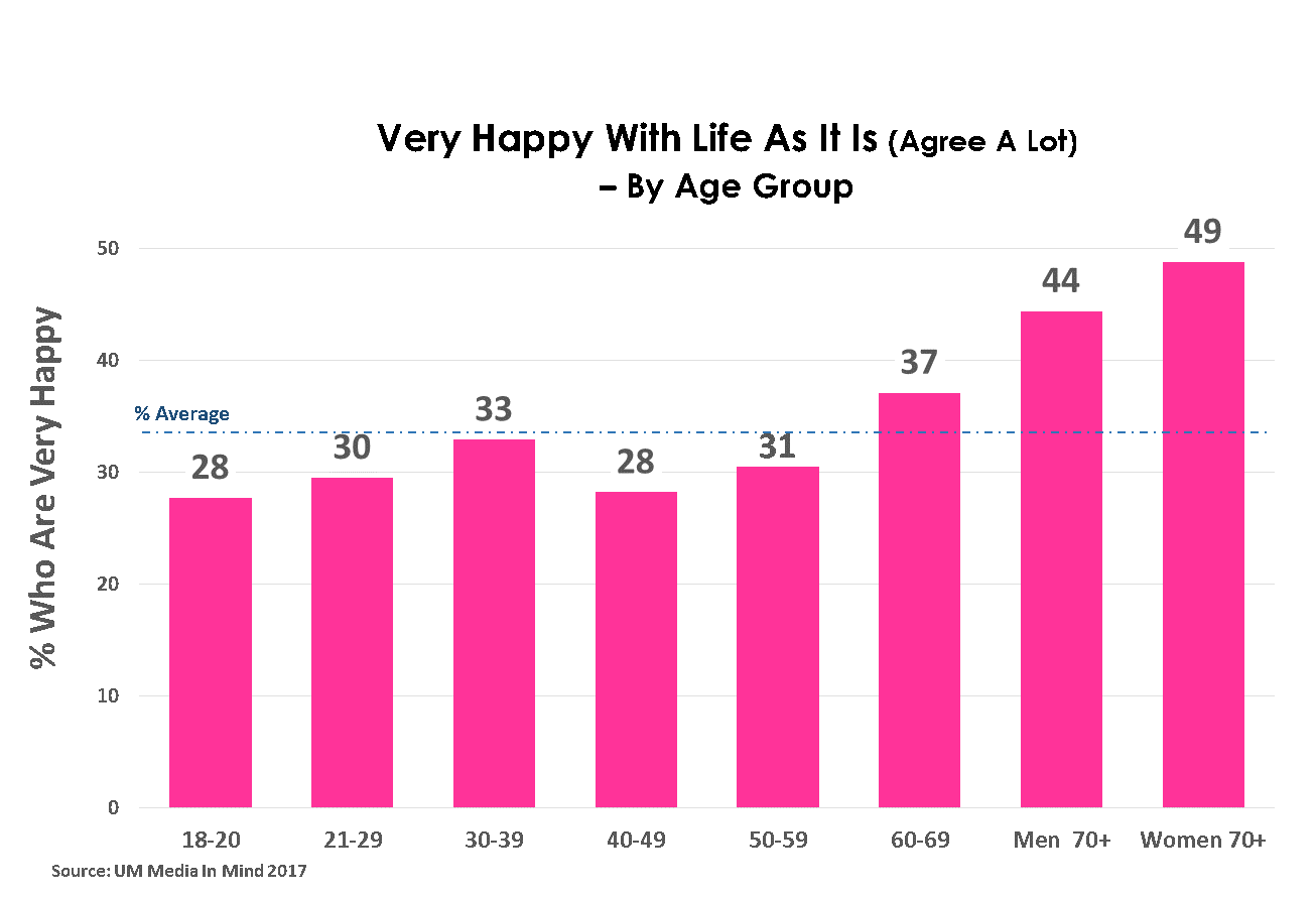 Age is one of the overarching factors affecting how happy we are in life. People in their 70s or older tend to be the happiest of all generations; various studies confirm this. UM's annual study of consumers' media consumption and lifestyles, Media in Mind, shows women who are 70-plus tend to be the happiest of all. Forty-nine percent of women age 70-plus agree a lot with the statement "I am very happy with my life as it is."
