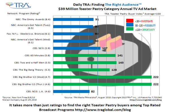 You don’t need to look very far for signs of America’s infatuation with Toaster Pastries, crispy on the outside and warm and yummy inside. Just this past summer a major toaster pastry manufacturer launched a mega popup store in New York’s Times Square to serve up the sweet confection. But how could they have gotten their message out? Had they incorporated TRA’s Media TRAnalytics® into their communications planning process they would have known CBS’s line up of 60 Minutes, Two and a Half Men, and Big Brother have the largest concentration of their category purchasers. Find The Right Audience™ with TRA.