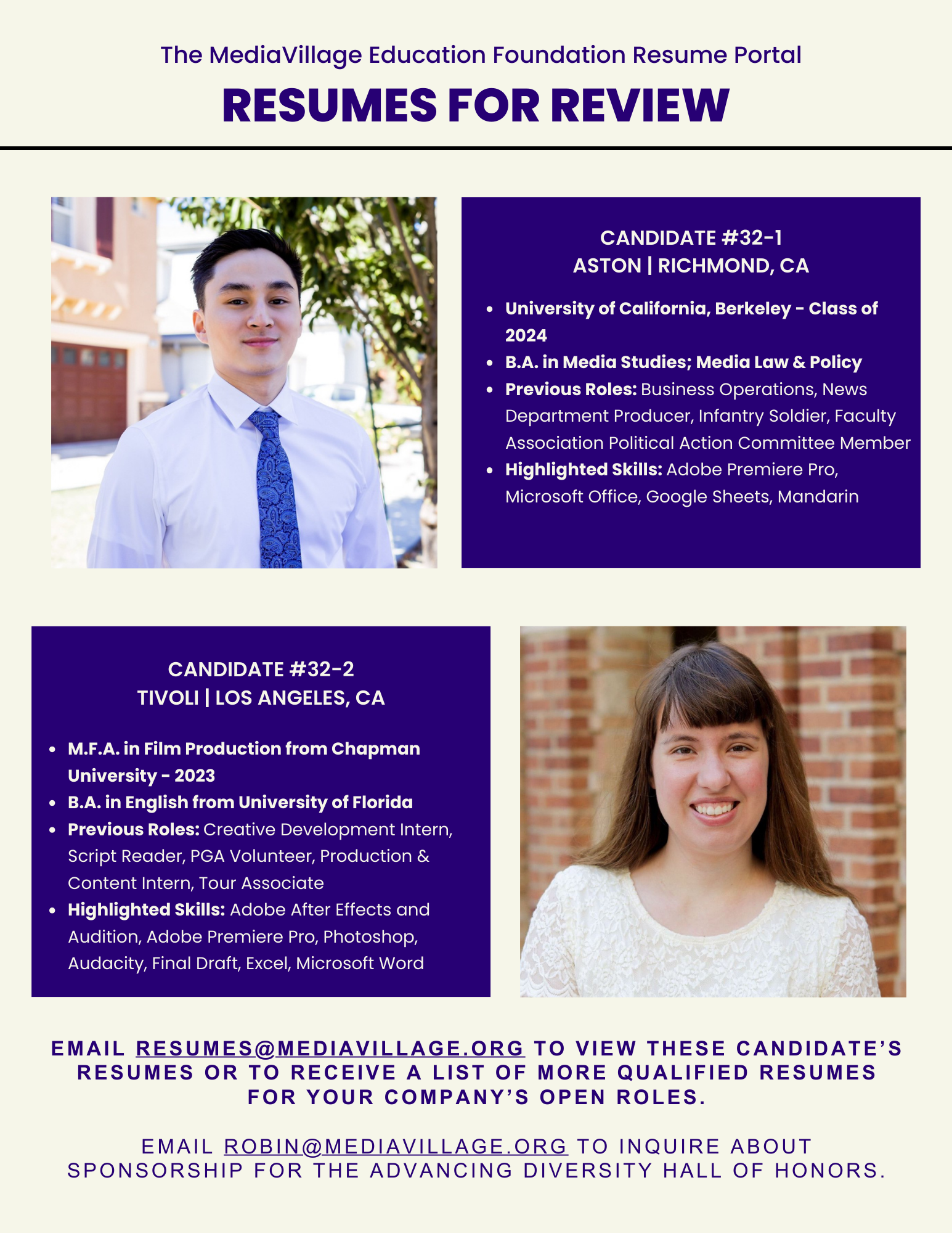 E-mail resumes@mediavillage.org to be connected with candidates. Resumes are listed with permission.