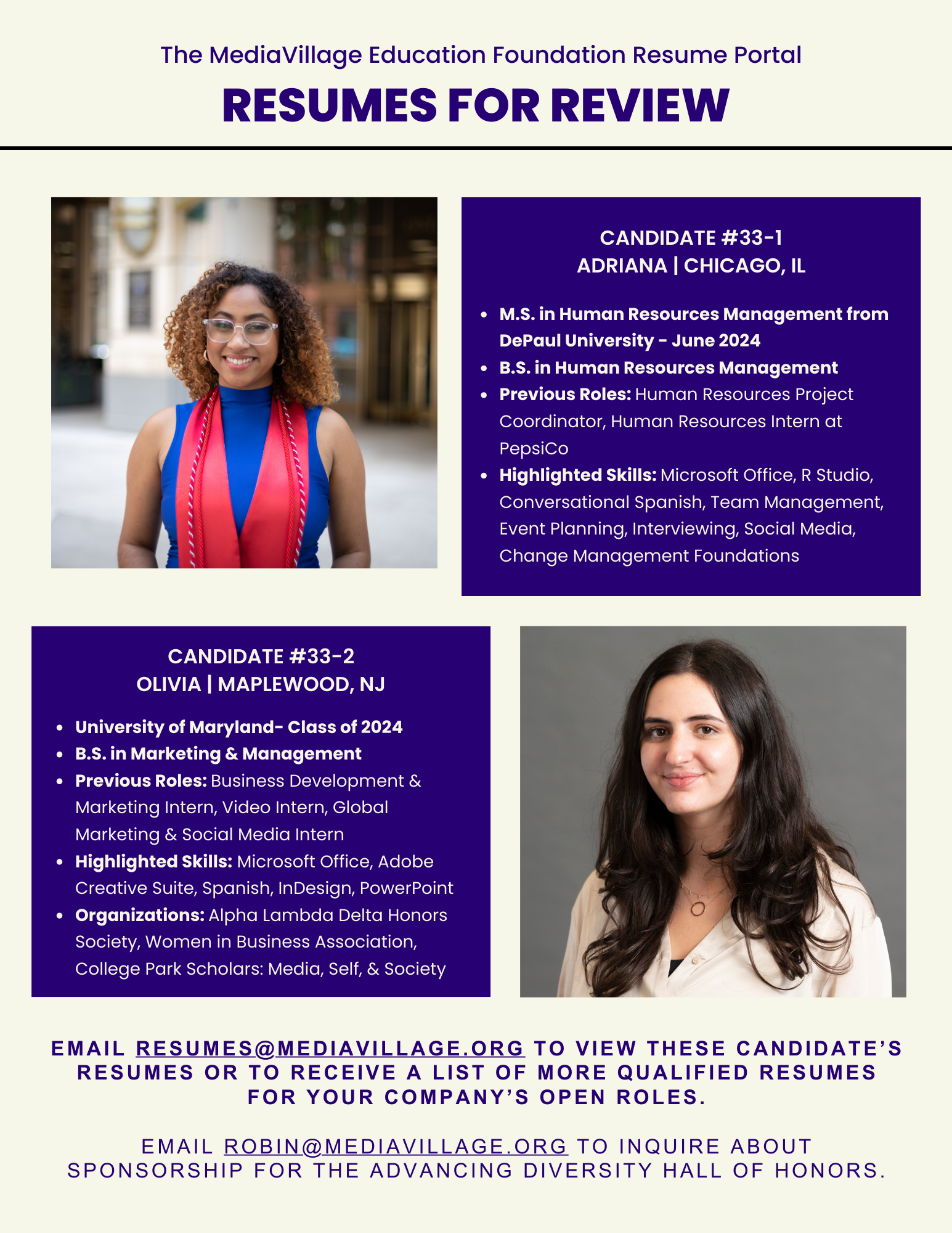 The MediaVillage Education Foundation coordinates with college career centers and organizations to attract diverse talent to our community. Each week in this space we are highlighting profiles of candidates who have submitted resumes at our AdvancingDiversity.org Resume Portal, where anyone looking to join the media and advertising business is encouraged to submit their CV and be connected to hiring teams. Watch for this weekly Resumes for Review e-mail.
