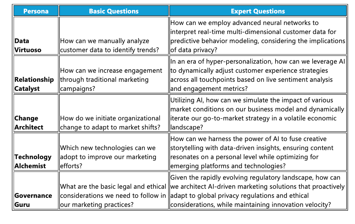 The table below highlights the key questions that need to be asked by marketers for each of the five personas – those that are early in their AI learning (basic questions) and then those that are operating at an advanced level (expert questions).