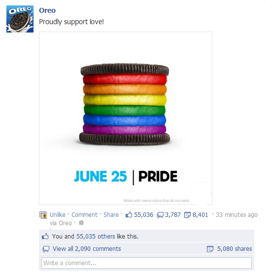 Oreo's captured awards and kudos for their creative use of social media to become a part of the conversation of the day. Oreo didn't shy away from controversy when they showed their rainbow themed cookie. Even in 2012, this simple image led to boycott threats.