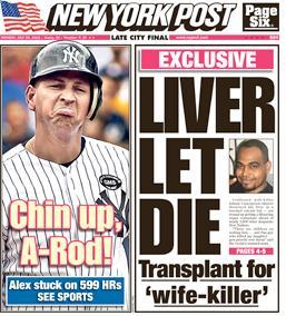 This was on the cover the New York Post on July 26th 2010. Besides A-Rod's frown, it's the beginning of an article on the JohnConcepcion case. The Post reported that Concepcion (a convicted murderer who had damaged his own liver by attempting suicide) had somehow made it to the top of the transplant list ahead of seemingly more deserving people, and been given a liver transplant.