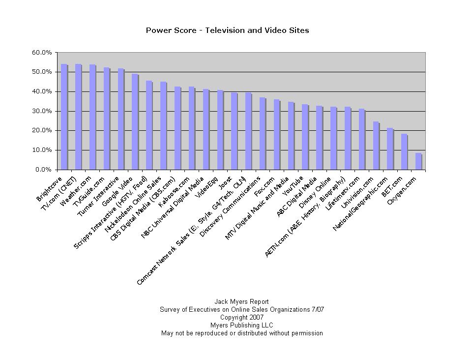 In the Sixth Annual Myers Survey of Advertising Executives on Online Sales Organization Performance, the television and video category included 25 sites ranging from traditional television networks, video entrants from portals, including Google Video and YouTube and stand-alone video websites like Videoegg and Brightcove. Although Brightcove is a less known brand and its sales were taken over shortly after the completion of this survey by Tremor Media, among those limited number of respondents who are familiar with them, they received the highest Overall Performance Power Score in the study, which was fielded in June. TV.com and Weather.com had nearly identical scores and were ranked second and third in this category, with TVGuide.com and Turner Interactive ranked 4th and 5th. Across all sites analyzed in 2006, Weather.com was ranked first. Among the 125 sites ranked in this years’ survey, Weather.com is ranked five. Television and video sites fared well overall – three of the top ten rated web sites across all sites in the survey are in this category.