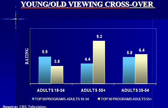 "Contrary to the common belief that the younger skewing programs will deliver the older audience much more effectively than the older skewing programs will deliver the young audience, we see that the older skewing programs' delivery of young adults is not much lower than the younger skewing programs' delivery of older viewers. And the Top 30 programs with Adults 55+ deliver a higher rating among the key, middle-aged, Adults 35-54."