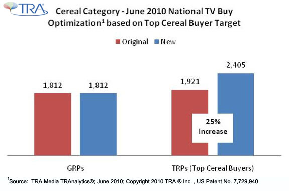 We saw that among the top rated Broadcast programs there was an opportunity for Cereal advertisers to explore an improved allocation of their TV dollars. Using consumer purchase behavior, in this case the top buyers of Cereal, we built an optimized scenario using TRA’s patented Media TRAnalytics® to identify a plan for the category that identifies the best program environments to reach these top Cereal buyers while maintaining the same level of gross rating points (GRPs). We were able to fine tune the plan using TRAs True Target Index and yielding a 25% improvement in the target rating points (TRPs). You may be thinking – sure, but it probably cost more to achieve that – well, we actually did this while also reducing costs (based on industry averages) by 14%. More effective, more efficient allocation of my media dollars – now that’s healthy for my business.