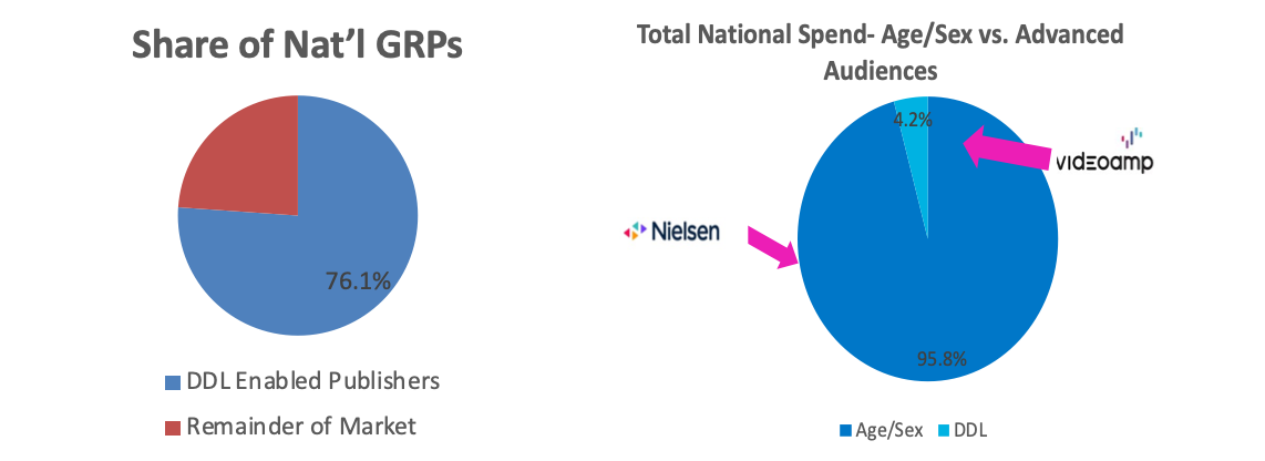 But today, heading into the 2025/2026 upfront, while over 75% of national GRPs are controlled by publishers enabled for DDL, only about 4% of national TV ad spend uses publisher optimization capabilities for DDL. The other 96% are bought based on traditional age/sex, even if they are planned based on advanced audiences.