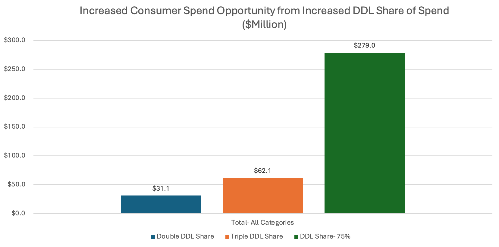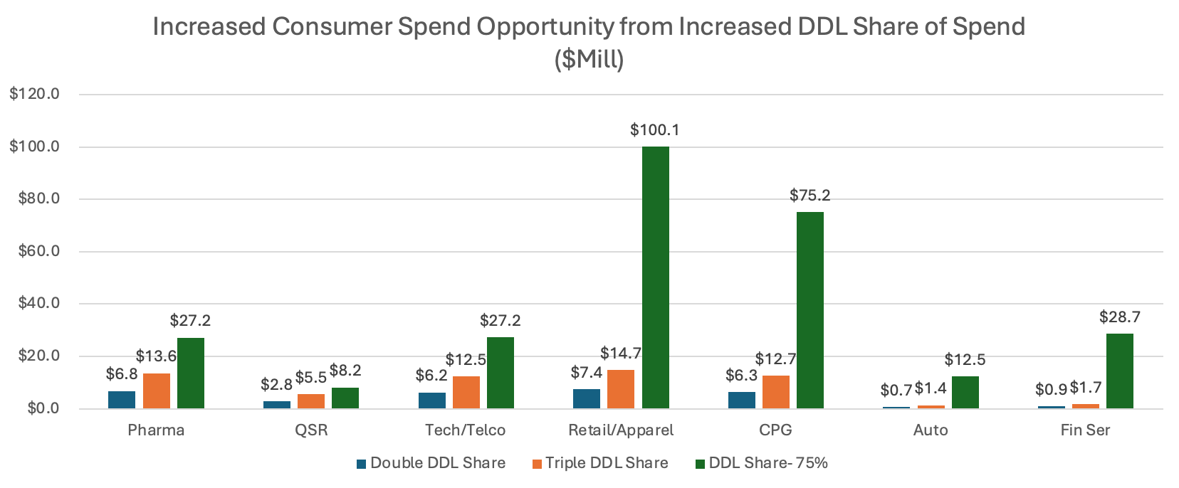 Focusing on seven advertiser verticals (Pharma, QSR, Technology & Telcom, Retail/Apparel, CPG, Automotive and Financial Services), we found that these verticals could generate an additional $31million per year in sales by doubling DDL’s share, and additional $62 million by tripling DDL’s share, and an additional $280 million by leveraging DDL for all spend with DDL enabled publishers.