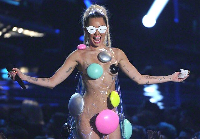 Miley Cyrus likes to smoke pot and show off her tits. (Her choice of words, not mine.) That was the takeaway from her gig as host of the 32nd annual VMA Awards on MTV Sunday night – and most of her pre-show publicity, as well, which included an appearance on ABC’s “Jimmy Kimmel Live” in which she wore an outfit that covered most of her body except for her breasts. They were bare except for strategically placed pasties.
