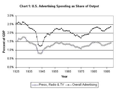 Advertising has traditionally expanded at the same rate as the gross domestic product, with about a six month lag as the economy entered and exited from recessionary periods. Dating as far back as 1952, advertising has consistently ranged from a high of 2.5% of GDP to a low of 1.7%.
