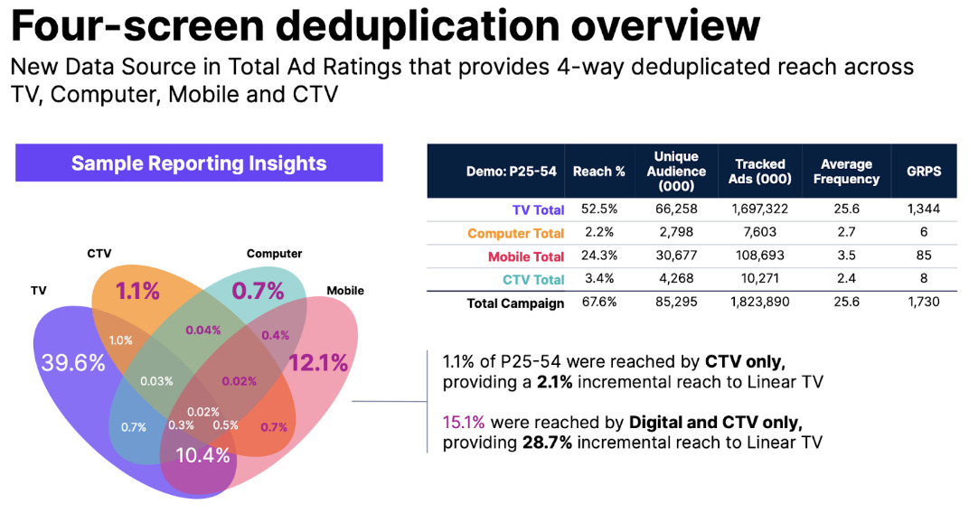 This is how it is possible for Nielsen ONE to report the frequency in each tiny chunk of the Venn diagram showing how TV, CTV, computers and mobile devices carrying the ad work together.