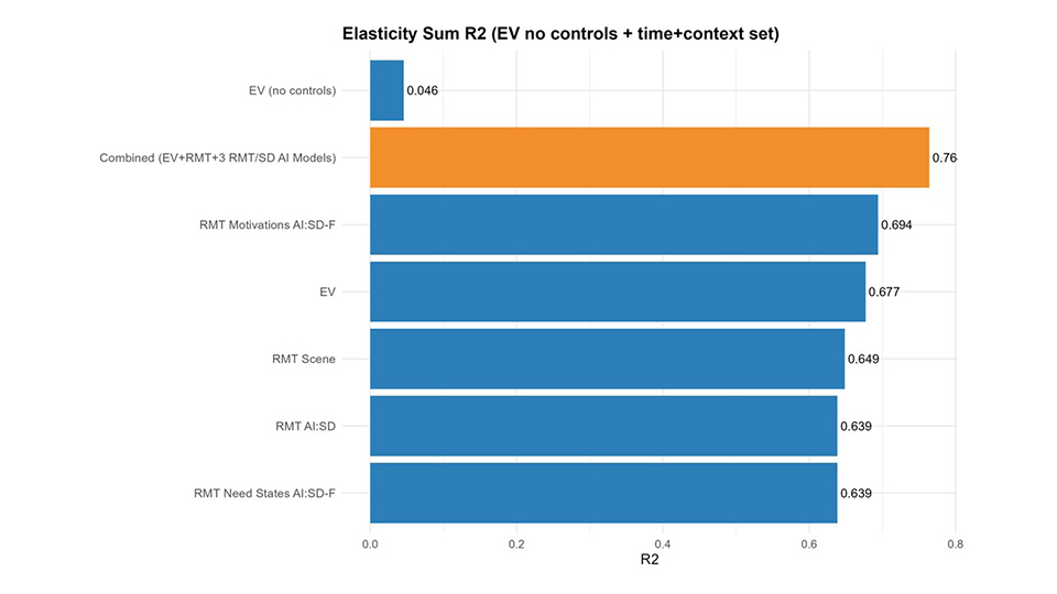 The HBDT EV, having learned from the RMT context effects on the 540 human subjects, and adding more proprietary AI science on top of RMT, slightly surpassed the Human Intelligence-based RMT Resonance scoring which achieved 0.649 (“RMT Scene” in the chart below). Three other AI approaches developed based on RMT semantic structure by RMT and Wharton partner Source Digital clustered around the same range.