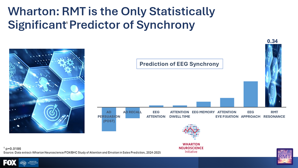Now, as part of a FOX-sponsored EEG study of context effects, Wharton Neuroscience has found that the best predictor of Synchrony is RMT ad-context Resonance scores. The RMT correlation with Synchrony in the study achieved statistical significance at 95% confidence. None of the other predictors tested achieved statistical significance.