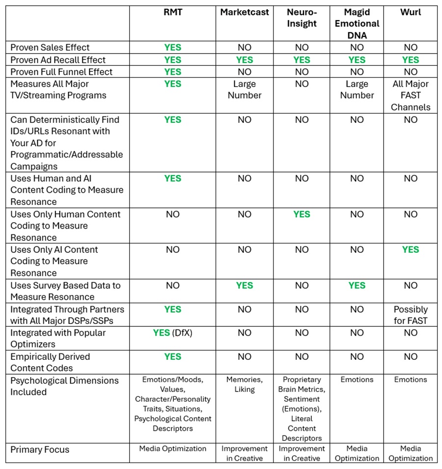 All of these methods used by RMT, Marketcast, Neuro-Insight, Magid, and Wurl work to make advertising more successful. We recommend testing all of them against sales and branding effects. The minimal cost of testing is strongly justified by the known very substantial increases in ad recall and sales and all other funnel measures, depending on the method. Media selection which does not use any method of including impression quality is on its way out. The recent surge of attention measurement for the purposes of better media selection and better ad creation opened the door which will not be closed. RMT is happy to partner with all other companies, including those that measure sales effect, or resonance, or attention, or drive to search/website/store traffic, to maximize the return on investment for brands and for content marketing. RMT’s current partners are listed here.
