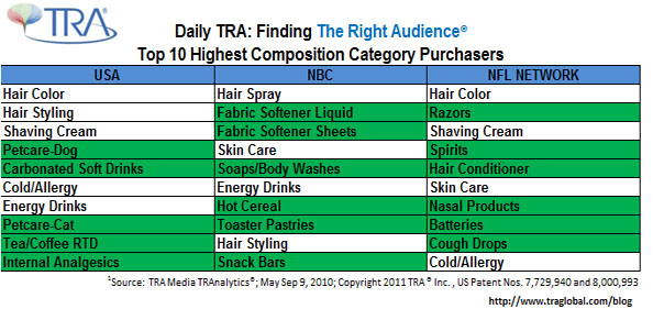 As you can see in the chart below, the composition of the audience for NBC during NFL opening kickoff is very different from the audience composition for the cable nets at the same time. While the largest concentration of category buyers on NBC were hair spray, fabric softener and skin care, the cable nets had a different mix of viewers with different CPG purchase habits.