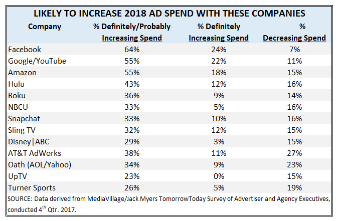 MediaVillage asked 750 advertiser and agency executives how likely they are to increase their 2018 ad spend with each of 55 media companies. Here are the companies (among the 55 evaluated) that appear to be best positioned to generate meaningfulrevenue growth in 2018. Our analysis is based on the percentage of respondents rating each company "5" (Definitely) and "4/5" (Definitely/Probable), and that do not have commensurate or greater percentages of respondents anticipating reductions in their investments with these companies.