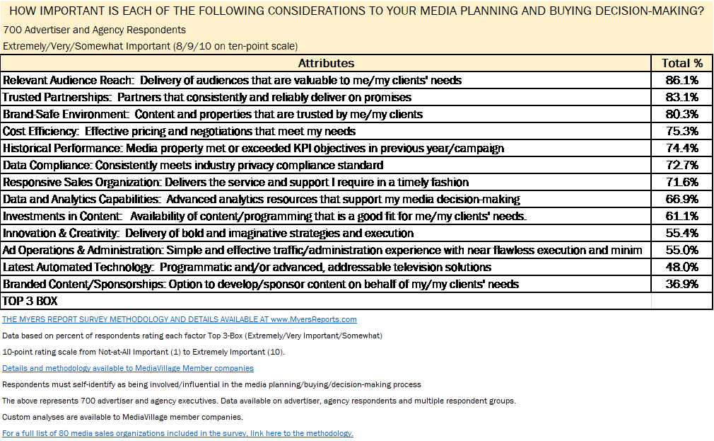 The Myers Report study clearly reflects that we are an industry that has become heavily commoditized, driven by data and analytics rather than by innovation, ideas, and creativity. Isn't it ironic that a business founded first and foremost on the principles of creativity is now placing innovation, branded content associations and investments in content toward the bottom of the hierarchy in terms of importance?