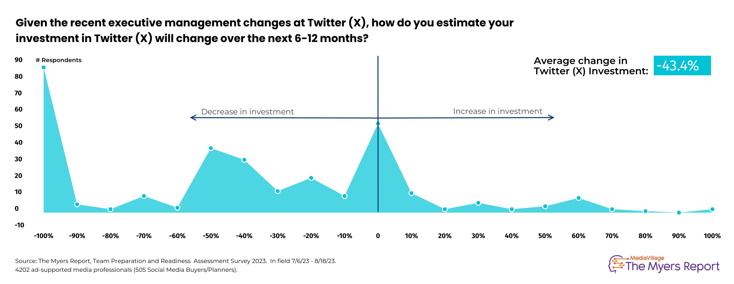 Whichever letter you choose, X's ad fortunes are predicted to be rocky for another 6-12 months. According to recent ad industry research from The Myers Report, social media buyers and planners across 14 top-tier agencies plan to decrease their current investment by an average of -43% over the next 6-12 months.