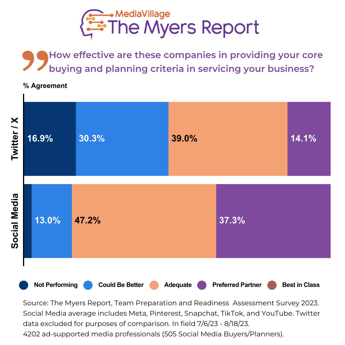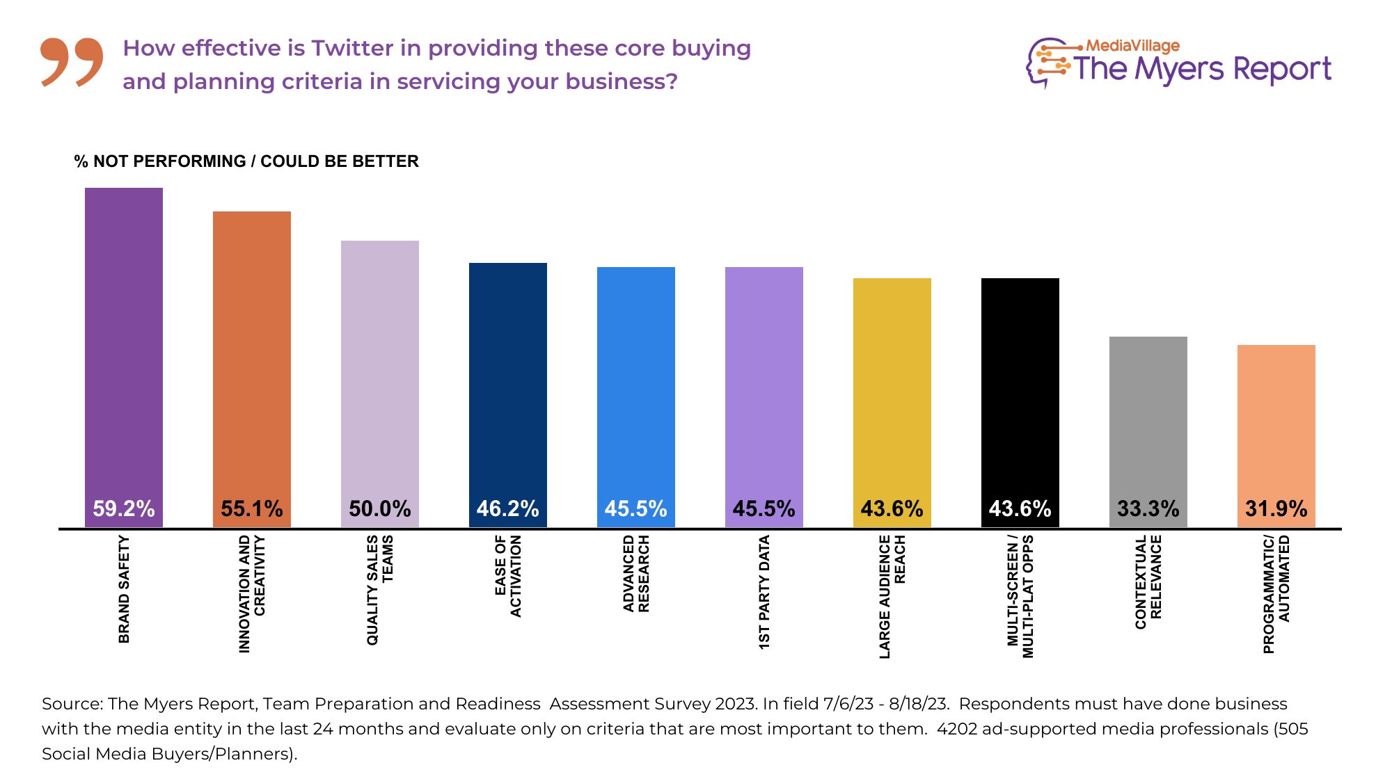 The Myers Report queried over 500 social media buyers and planners in July and August 2023 as part of its annual ad-supported industry study of 4200+ professionals. The survey revealed that nearly HALF (47%) believe that Twitter, now "X," is "not performing" for marketers or "could be better." This contrasts significantly with the social media industry average of 15%. The top three reasons behind this underperformance are Concerns Over Brand Safety (59%), Lack of Innovative/Creative Opportunities (55%) and Lack of Quality Sales Teams and Personal Relationships (50%).