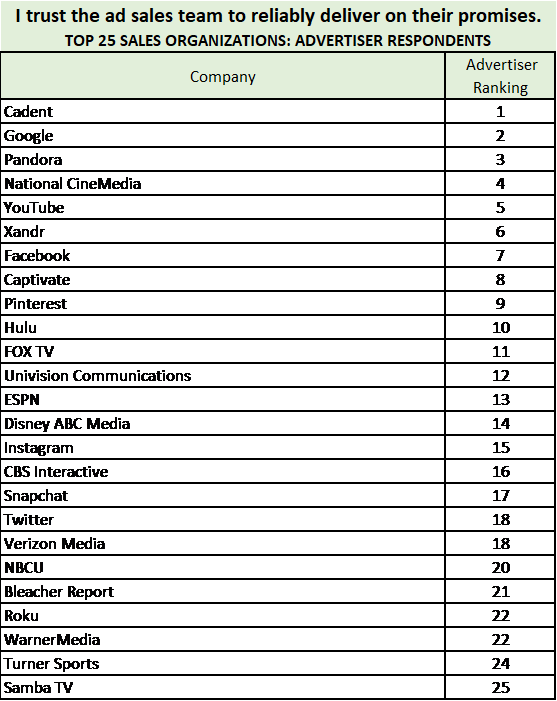For the attribute I trust the ad sales team to reliably deliver on their promises, across 80 media organizations, here are the TOP 25 sales organizations among different respondent groups.
