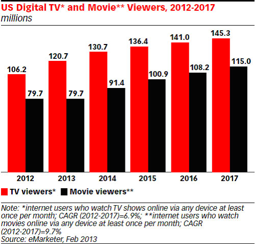 We have already cited the eMarketer forecast for OTT above. In addition, a new report from The Diffusion Group (TDG), “The Maturation of Netflix — US Streaming Subscriptions & Viewing thru 2022”, Netflix streaming use in the US will double from 2013 to 2018 . “Online TV and movie service Netflix will continue its strong track record of success with domestic streaming forecast to reach 13 billion hours during 2013 and top 26 billion hours in 2018.”