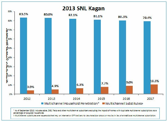 In a similar vein, SNL Kagan recently released a report isolating what they call Multichannel Substitutes, defined as households that rely on Internet or OTT delivery to view television shows or movies in lieu of a traditional multichannel subscription. According to SNL Kagan this segment could account for 10% of the population by 2017 while Multichannel Household Penetration is expected to steadily decline.