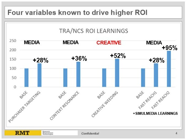 Lookalike targeting however has rarely, in my experience, achieved better than 10% ROI lift. So, the size relationship between targeting and context varies depending on what kind of targeting one is talking about. If it isn't deterministic and addressable, targeting and context are about equal to each other and to fast reach. All should be used together. And developing better creative deserves the most attention.