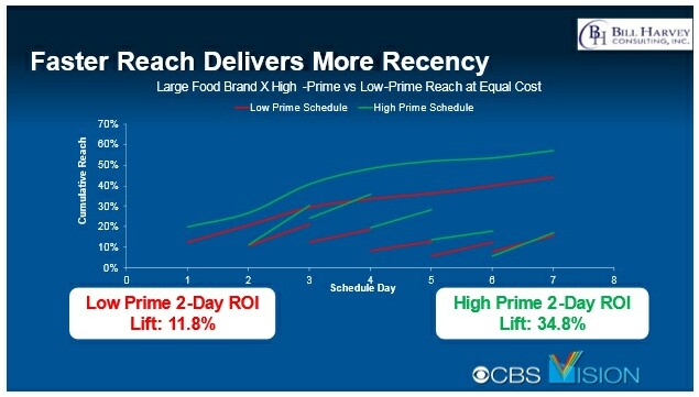 Let's look at the final lever on the slide above. Fast reach -- let's say reach per average day -- has more sales effect than slow reach, and far more sales effect than low reach for obvious reasons. By why should the speed of the reach make a difference? It's because of that phenomenon Erwin Ephron told us about, recency. The faster the reach, the more recency, no matter when the prospect goes shopping. This is demonstrated in an ARF study I did with Dave Poltrack (CBS) and Leslie Wood (Nielsen NCS):