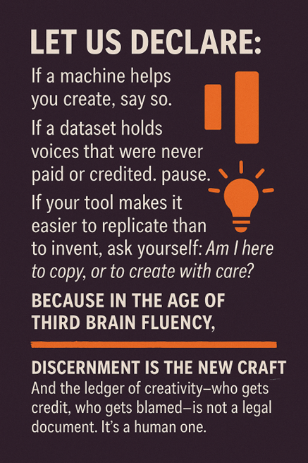 As we enter the era of Third Brain fluency, creation is no longer defined by originality alone, but by discernment --the capacity to choose integrity over imitation. Legal frameworks and copyright laws cannot govern empathy, compassion, or care. Only humans can. The future of creativity will not be written in contracts or code; it will be shaped in conscience.