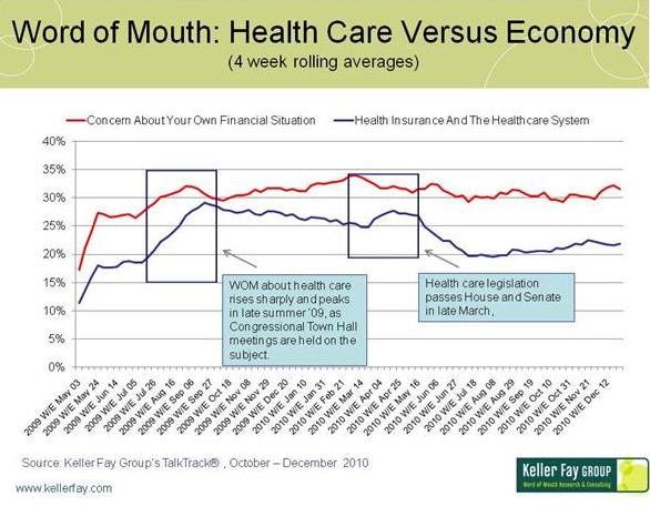 In the fourth quarter of 2010, a period that included the run up to the election as well as the Lame Duck Congress that followed, we were measuring daily the major issues about which the American people were talking, either offline or online. "Health insurance and the health care system" ranked 10th out of 17 areas tracked during this period. Economic issues dominated the list – topics such as people's concern about their financial situation, ways to cut back on expenses, looking for a job or worrying about losing one. Education and energy costs also were discussed more frequently than health care.