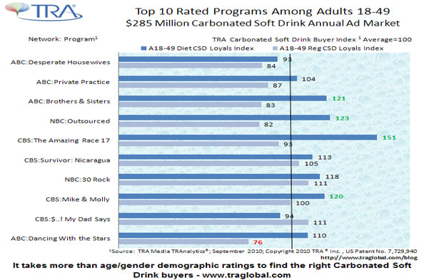 Looking for a way to improve your return on media investment? Here’s a tip, change the way you look at the picture to determine in which programs you advertise. Leveraging TRA’s patented Media TRAnalytics® purchaser targets bring new information into the media planning and buying arena. For example, below the programs have been ranked on plain, old, ordinary ratings for households with Adults age 18 to 49. But, when you look at those same programs by their concentration of Adults 18-49 who buy Diet Soft Drinks loyally versus those Adults 18-49 who buy Regular Soft Drinks loyally, you see a completely different picture. Four of the top 10 have a significantly higher concentration of Adults 18-49 who are Loyal Diet Soft Drink buyers, and one of these programs has a very low concentration of Adults 18-49 who are loyal buyers of regular Soft Drinks. Remember with TRA, these purchases are based on ACTUAL purchase behavior, not recall, or surveyed information. With these new learnings, you would plan, buy and improve ROI.