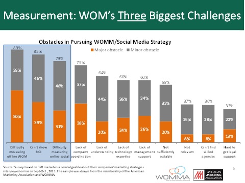 Standing in the way of bigger investment in word of mouth and social media marketing, however, are difficulty measuring offline WOM (89%), showing return on investment (85%) and measuring online social media (79%).