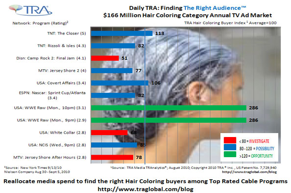 If you don’t assume an age/gender profile when it comes to making efficient use of your advertising dollars, you can find who The Right Audience™ is by using TRA’s Media TRAnalytics®. With Media TRAnalytics®, you will learn that WWE Raw viewers on Monday nights indexed the highest among the top 10 rated cable shows for the week of August 30th when it came to purchasing Hair Color products to drive ROI. So let’s put the sleeper hold on assumptions because… ‘willful waste brings woeful want’.