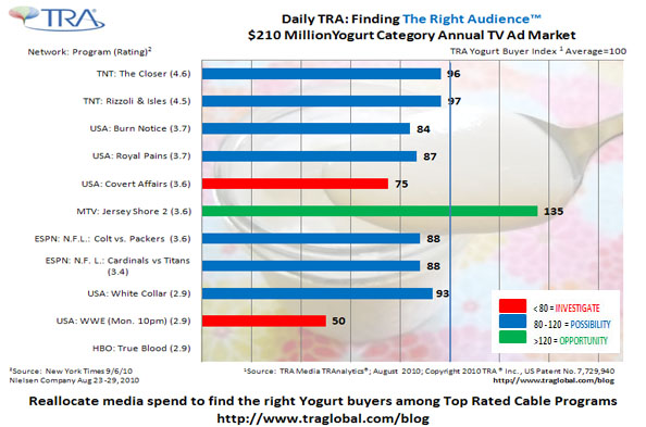 One of MTV’s most popular programs is now the best bet for promoting Yogurt to regular Yogurt buyers. Advertisers of products such as Yogurt want to know that they are not only capitalizing in terms of exposure on the hottest programs on TV but that they are actually maximizing their return on investment at the same time by capturing the attention of the right audience as well. With TRA’s Media TRAnalytics®, Yogurt advertisers will now know the best programs to run their message to ensure they are reaching The Right Audience™, Yogurt buyers. To learn more about reallocating media spend to maximize ROI, visit http://www.traglobal.com.