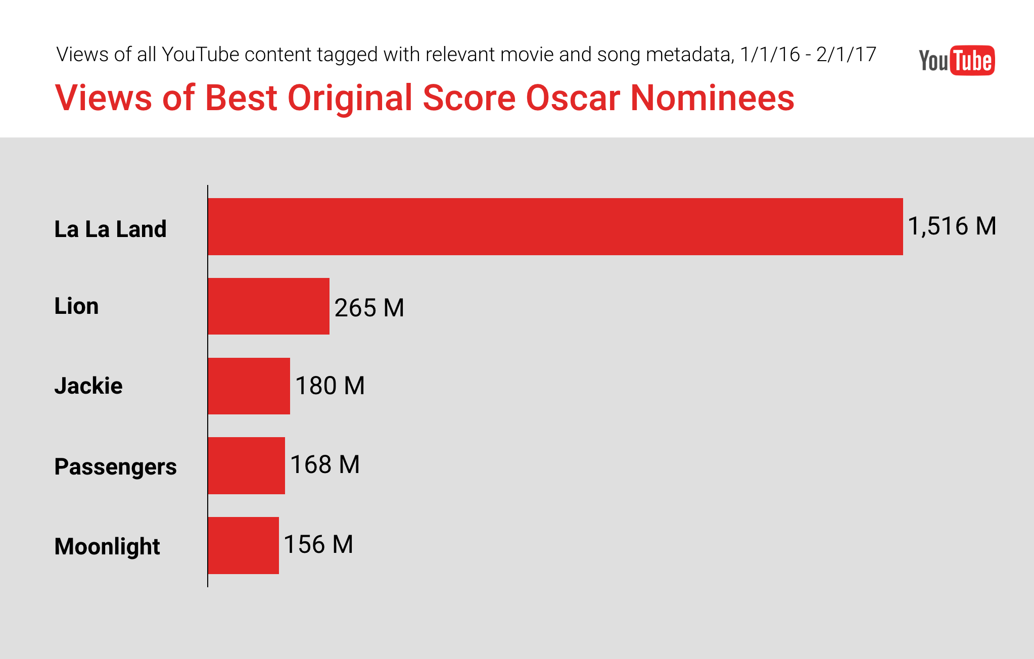 Case in point: La La Land is running away with the competition for YouTube views among the nominees for Best Original Score, with over 1 billion views of its music, both in clips of the movie and covers by fans.4